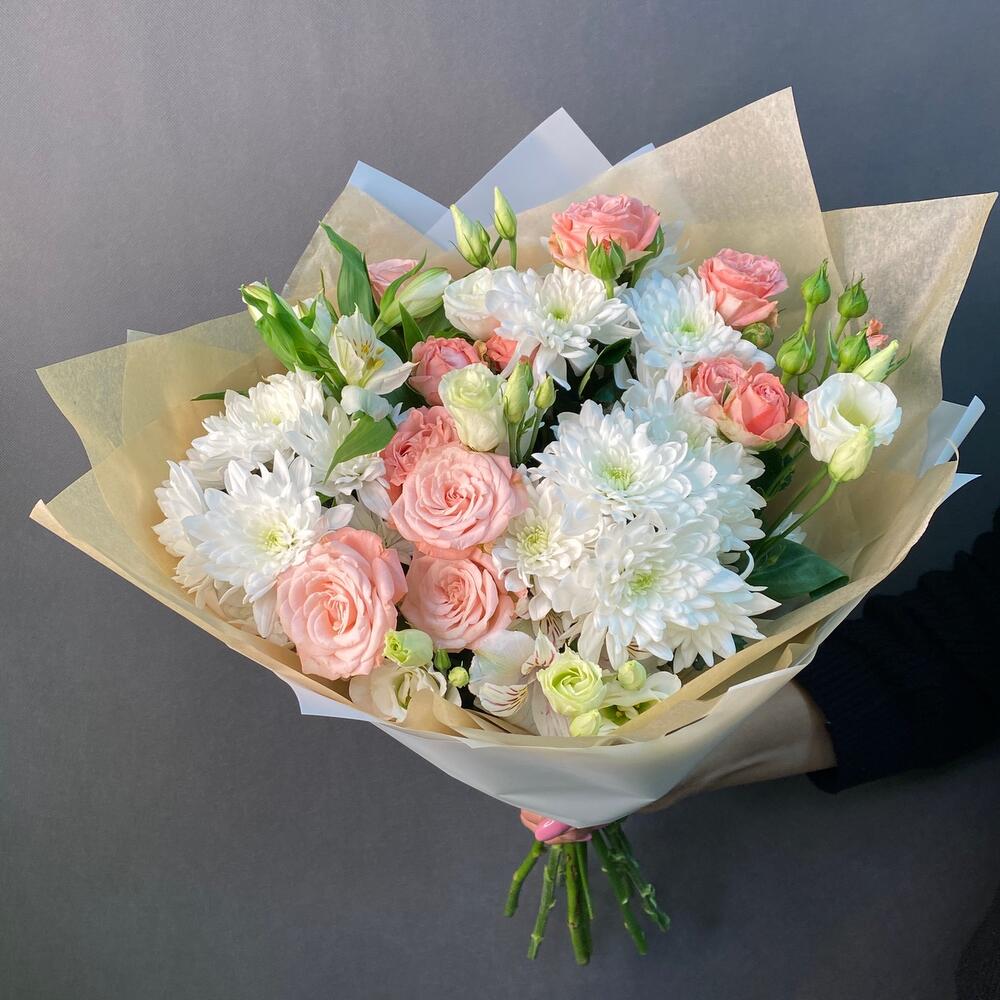 Категорий: Альстромерии, Кустовые розы, Лизиантусы, Пионовидные розы, Розы, Хризантемы
