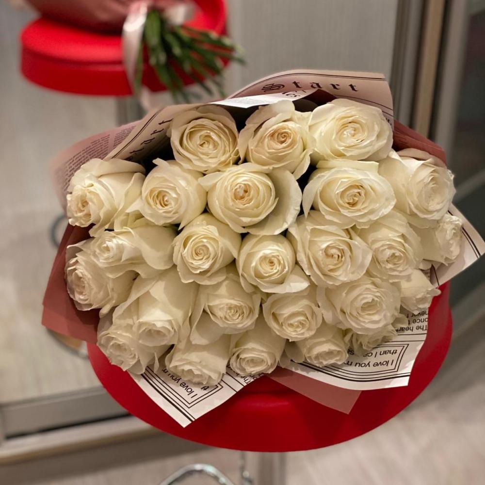 Лента атласная – 1 шт.Упаковка дизайнерская – 3 шт.Роза одноголовая эквадор 50 см – 25 шт.