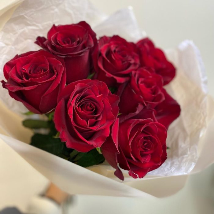 Упаковка с атласной лентой – 5 шт.Тишью белое – 2 шт.роза эквадор эксплорер премиум – 7 шт.