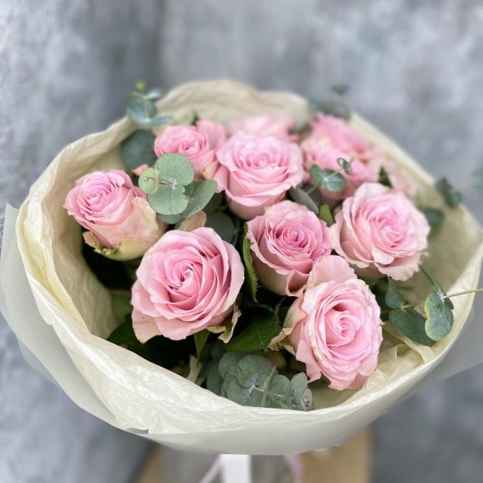 Роза – 11 шт.Эвкалипт – 2 шт.Упаковка дизайнерская – 2 шт.Лента атласная – 2 шт.