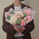 Рускус – 5 шт.Эвкалипт – 4 шт.Лента атласная – 1 шт.Кустовая роза Бомбастик – 2 шт.Гортензия розовая – 1 шт.Диантус розовый – 3 шт.Дизайнерская упаковка – 5 шт.стифа натуральная – 1 шт.