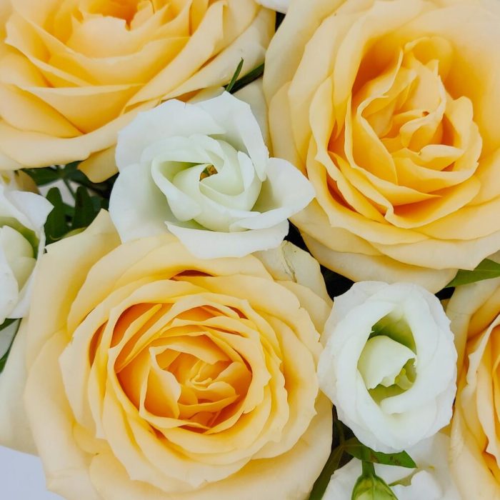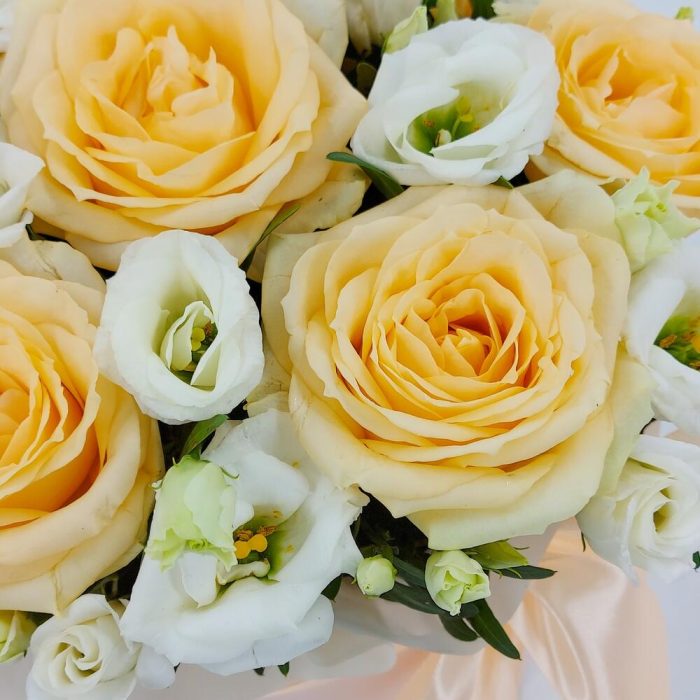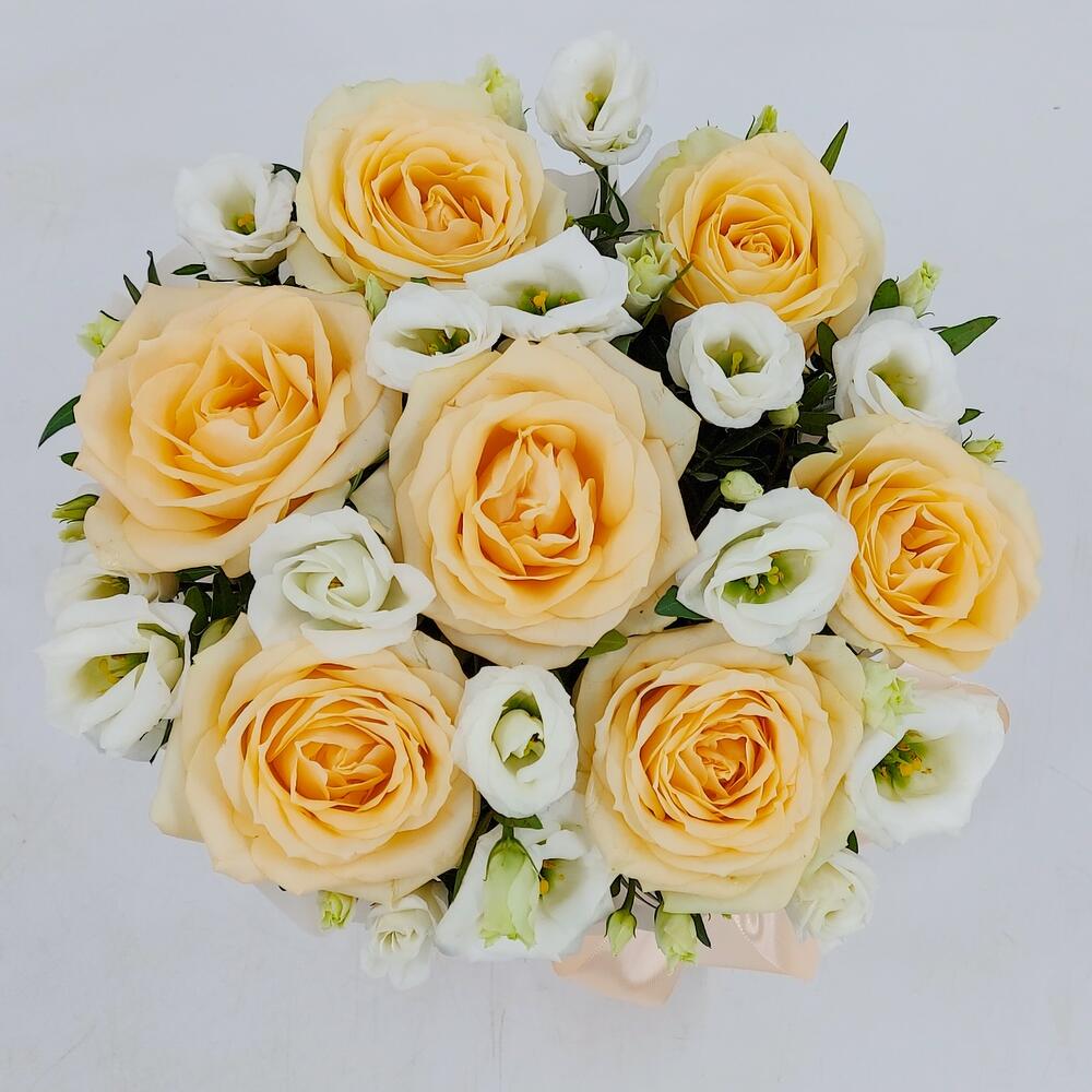 Нежнейшая композиция из пышных персиковых роз и белой эустомы. Такой презент всегда уместен и подойдёт для любого повода: День Рождения, именины, годовщина свадьбы, рождение ребенка, 8 марта, День Святого Валентина, выпускной и т.д. Можно вручить маме, сестре, подруге, коллеге, учителю, любимой.