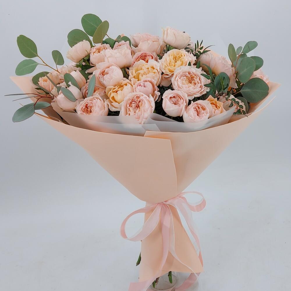 Эвкалипт – 3 шт.Упаковка дизайнерская – 1 шт.Пистация – 5 шт.роза кустовая пионовидная джульетта хани – 11 шт.