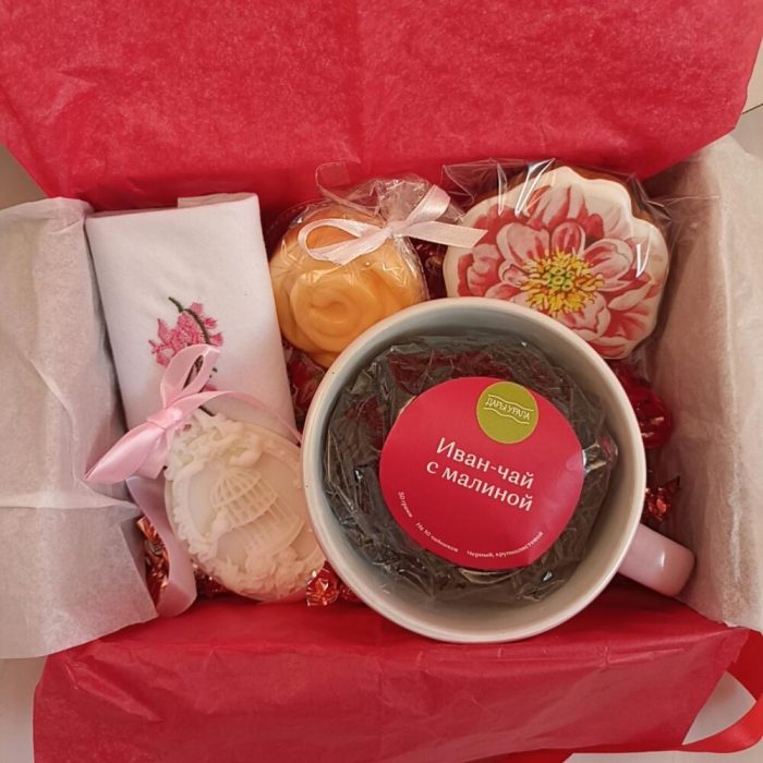Оригинальный подарочный набор с тем, что может удивить и порадовать любимого человека ❤В подарочный бокс входит:- Иван-чай, собранный в далекой Сибири вручную, с кусочками малины и без ароматизаторов- Кружка (400 мл)- Шоколадные конфеты (3 шт)- Мягкое мыло ручной работы «Роза» (подходит для ухода за кожей лица и нежной детской кожей)- Ароматное саше из воска с запахом «Манго-бергамот»- Пряник ручной работы «Пион» (без меда)- Хлопковый платочек с вышивкой- Choco-Pie с клубникой (2шт)- Трюфельные конфеты в корпусной оболочкеНабор упакован в подарочную упаковку алого цвета и крафтовую коробку с рисунком маков и надписью «Спасибо, что ты есть у меня!» ❤Наши необычные подарки придутся по душе каждой дочке, жене, маме, бабушке, любимой девушке или коллеге. Также поможем удивить отцов, дедушек, сыновей или внуков. Ведь пол и роль не важны, зато бывает так важно подарить чуточку внимания и тепла) А у нас есть все, чтобы Вам с этим помочь ❤Вы можете изменить состав подарочного бокса: -добавить открытку в конверте или без, в которой мы напишем Ваше поздравление- выбрать имбирные пряники с поздравлениями или просто с красивой картинкой- дополнить подарок чаем, брошками, сумками-шопперами, блокнотами, макаронс, кремами, масками для лица, мылом ручной работы- заменить то, что есть в набореДля этого пишите нам Если Вы добавляете позиции к набору, мы бесплатно поменяем упаковку размером побольше и оформим в том же стиле, что и упаковка в товаре. Обязательно пришлëм фото по готовности К каждому заказу кладëм сладкий комплимент. Можем собрать набор, оформить коробку или крафтовую объëмную фигуру, подобрать подарки в цвет, на любую сумму индивидуально для Вашего торжества