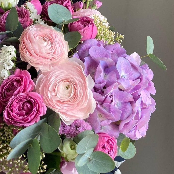 Садовая композиция в шляпной коробке с гортензиями, ранункулюсами, кустовыми пионовидными розам, душистой маттиолой, и эвкалиптом.