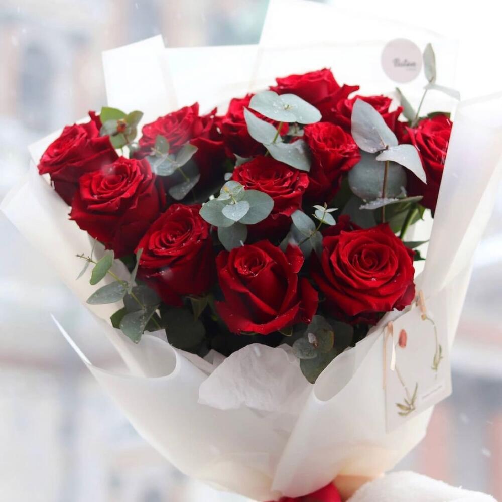 Роскошный букет из 11 красных роз с эвкалиптом для любимой