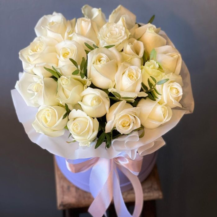 розы белые – 25 шт.Оазис флористический – 2 шт.Шляпная коробка – 1 шт.Пленка матовая – 1 шт.Лента атласная – 2 шт.работа флориста – 1 шт.