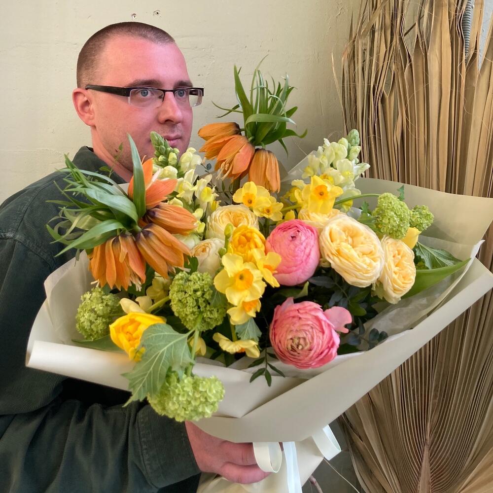 Авторский букет с рябчиками, ранункулюсами, нарциссами, калиной, кустовыми пионовидными розами и львиным зевом .