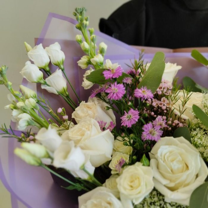 Сборный букет с розами, маттиолой, лизиантусом, эвкалиптом