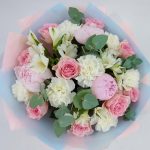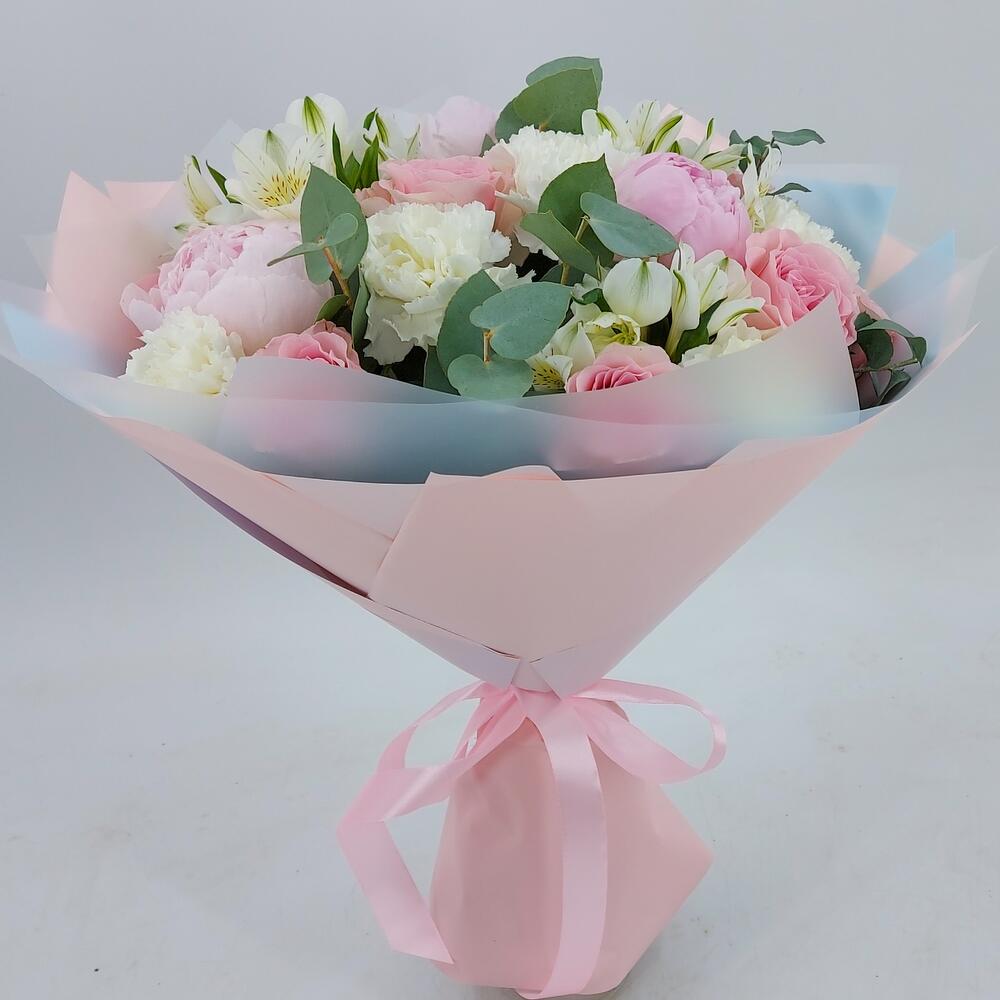 Пышный, ароматный букет с пионами, розами, альстромерией, диантусами и эвкалиптом. Такой букет всегда уместен и подойдёт для любого повода: День Рождения, именины, годовщина свадьбы, рождение ребенка, 8 марта, День Святого Валентина, выпускной и т.д. Можно вручить маме, … Показать ещёсестре, подруге, коллеге, учителю, любимой.