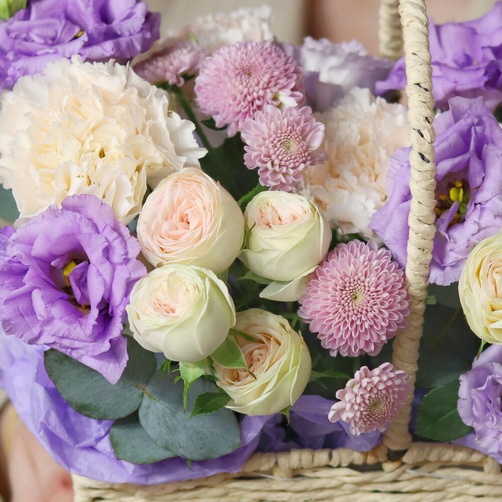 Сиреневая композиция в корзине с розами и эустомой