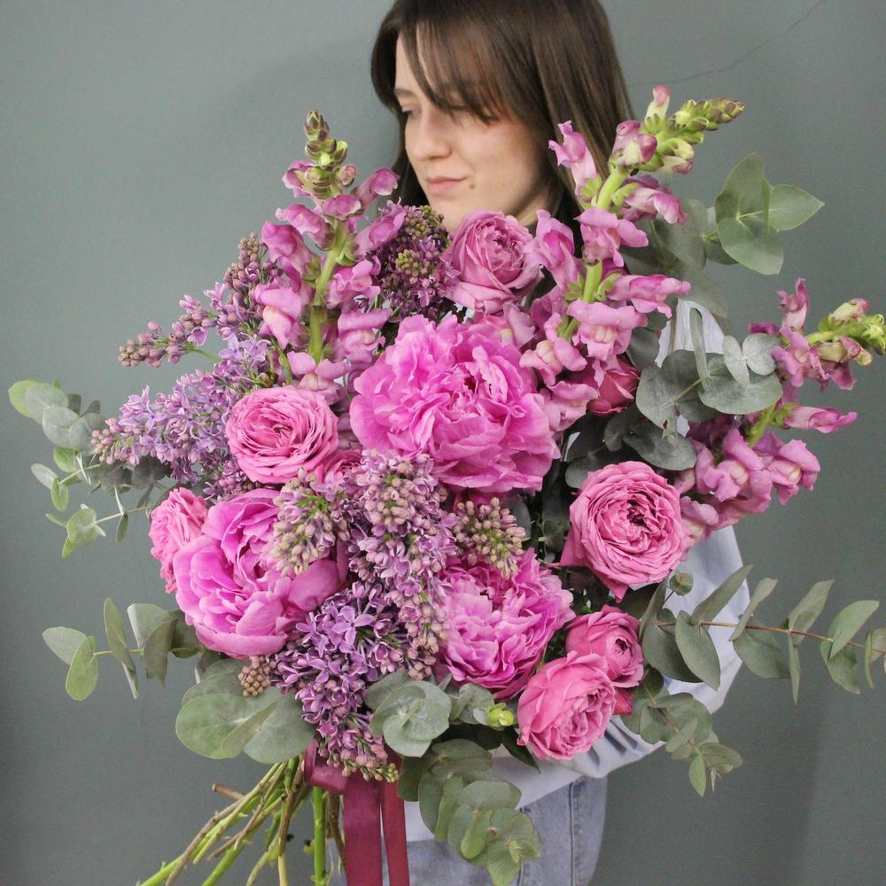 Букет с сиренью, пионами, львиным зевом, пионовидными розами и эвкалиптом.Отличный выбор для подарка на день всех влюблённых, 14 февраля.