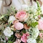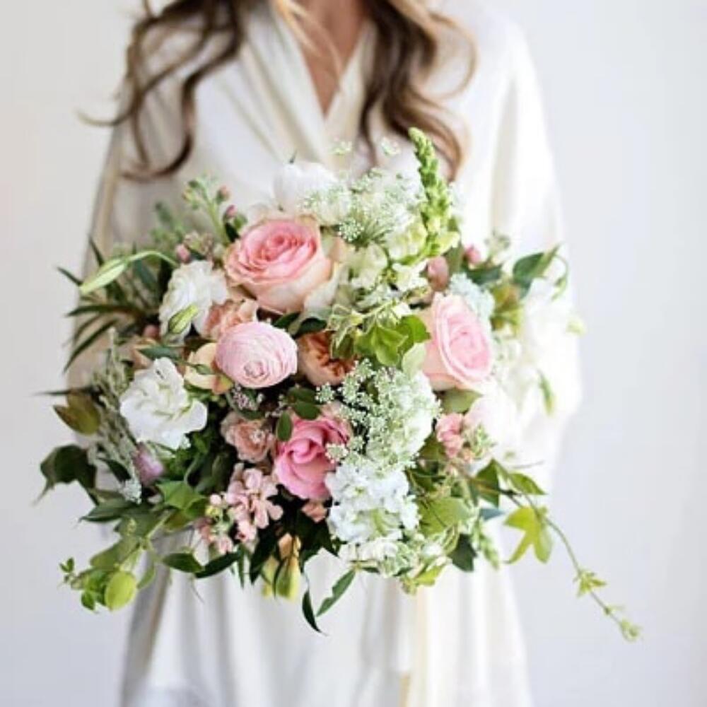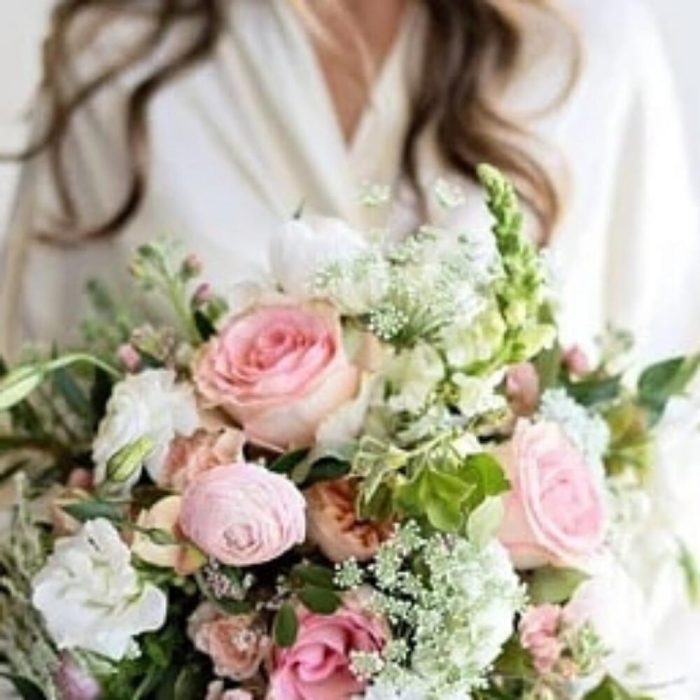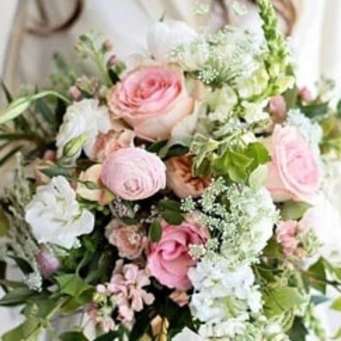 Роза пионовидная – 9 шт.Лизиантус белый – 9 шт.Роза – 7 шт.маттиола микс ароматная – 5 шт.Фрезия белая – 5 шт.зелень декоративная – 9 шт.Лента атласная – 2 шт.
