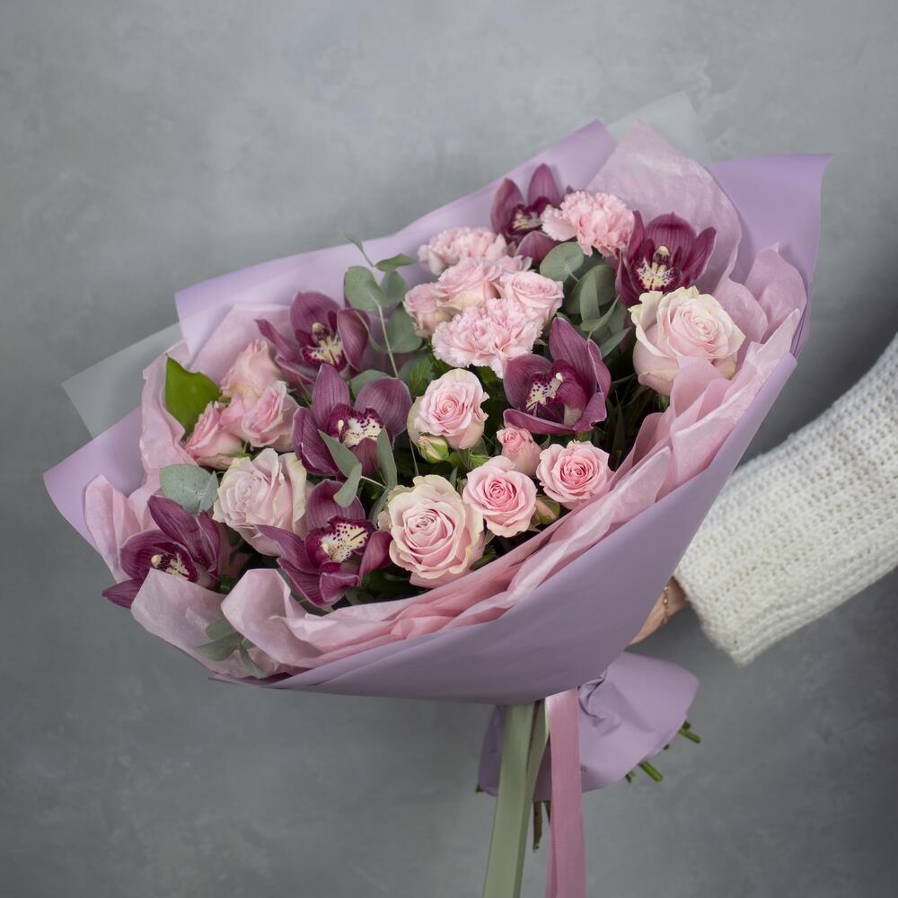 орхидея – 7 шт.Роза кустовая – 3 шт.Роза – 3 шт.Диантус – 3 шт.Эвкалипт – 3 шт.Фисташка – 3 шт.