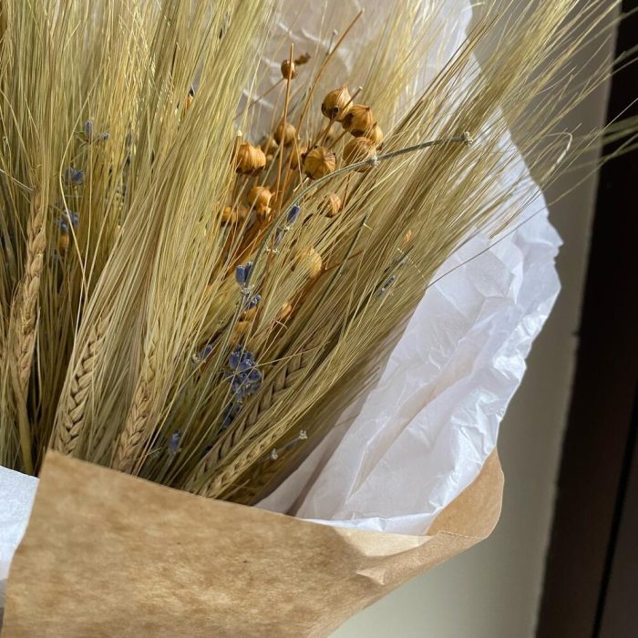 Лаванда (сухоцвет) – 3 шт.Пшеница пучок – 1 шт.Лен натуральный – 2 шт.Оформление – 1 шт.