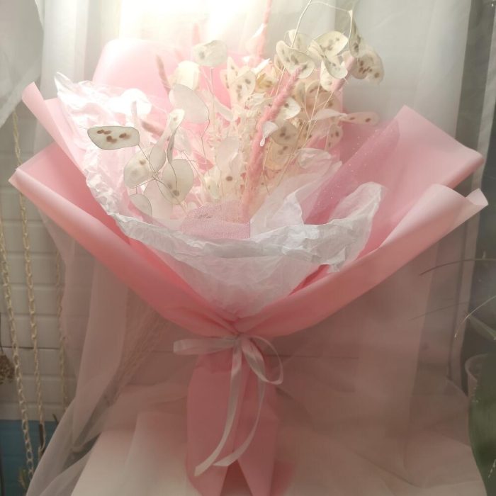 лунария стабилизированная банч – 1 шт.Лагурус (сухоцвет) – 6 шт.камыш декоративный – 2 шт.Тишью – 2 шт.сетка мерцающая – 1 шт.Упаковка дизайнерская – 2 шт.