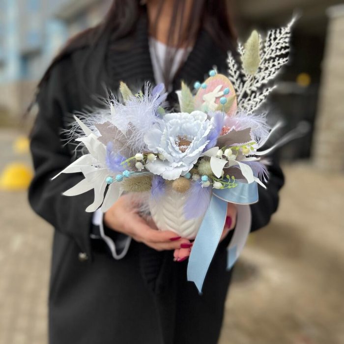 Композиция в керамическом кашпо из искусственных цветов и сухоцветов