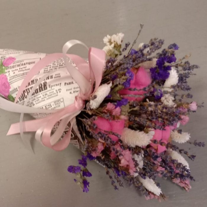 Лаванда (сухоцвет) – 15 шт.Статица – 2 шт.Хлопок – 3 шт.Конус упаковка – 1 шт.Колосья – 7 шт.