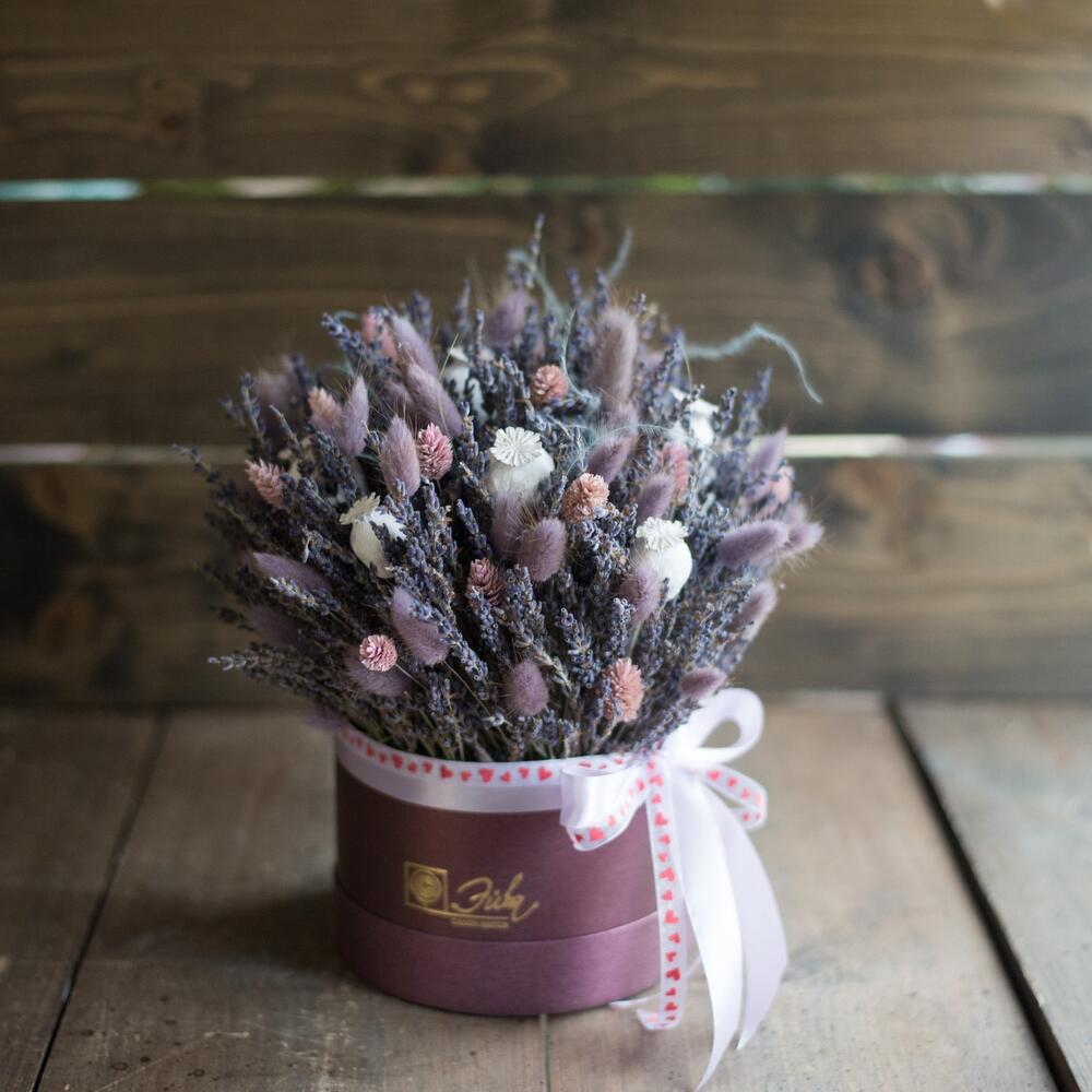 Лаванда (сухоцвет) – 159 шт.Лагурус (сухоцвет) – 30 шт.Шляпная коробка с лентой – 1 шт.Оазис флористический – 1 шт.
