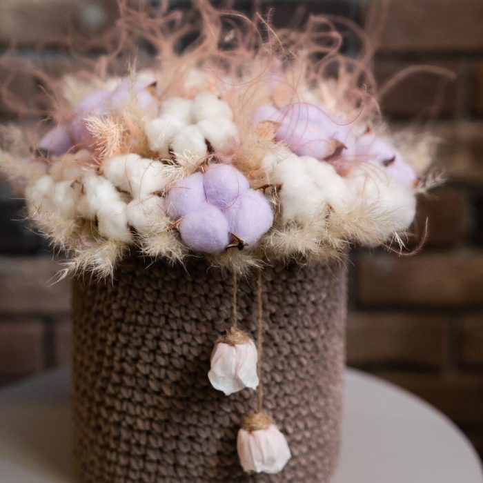Хлопок натуральный – 25 шт.Ковыль – 30 шт.аспарагус стабилизированный – 5 шт.Шляпная коробка – 1 шт.обвязка ручной работы – 1 шт.