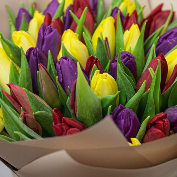 Букет из 51 тюльпана стандарт яркий микс в упаковке
